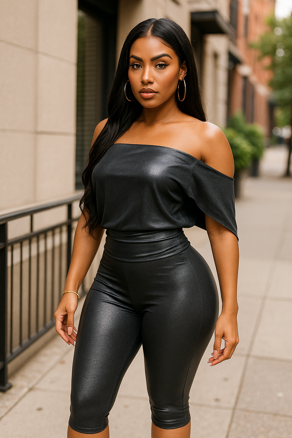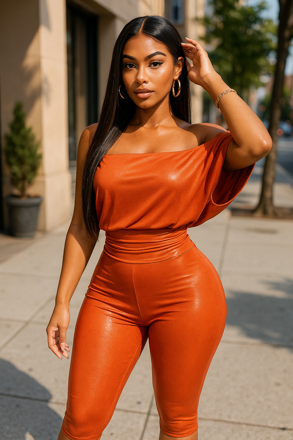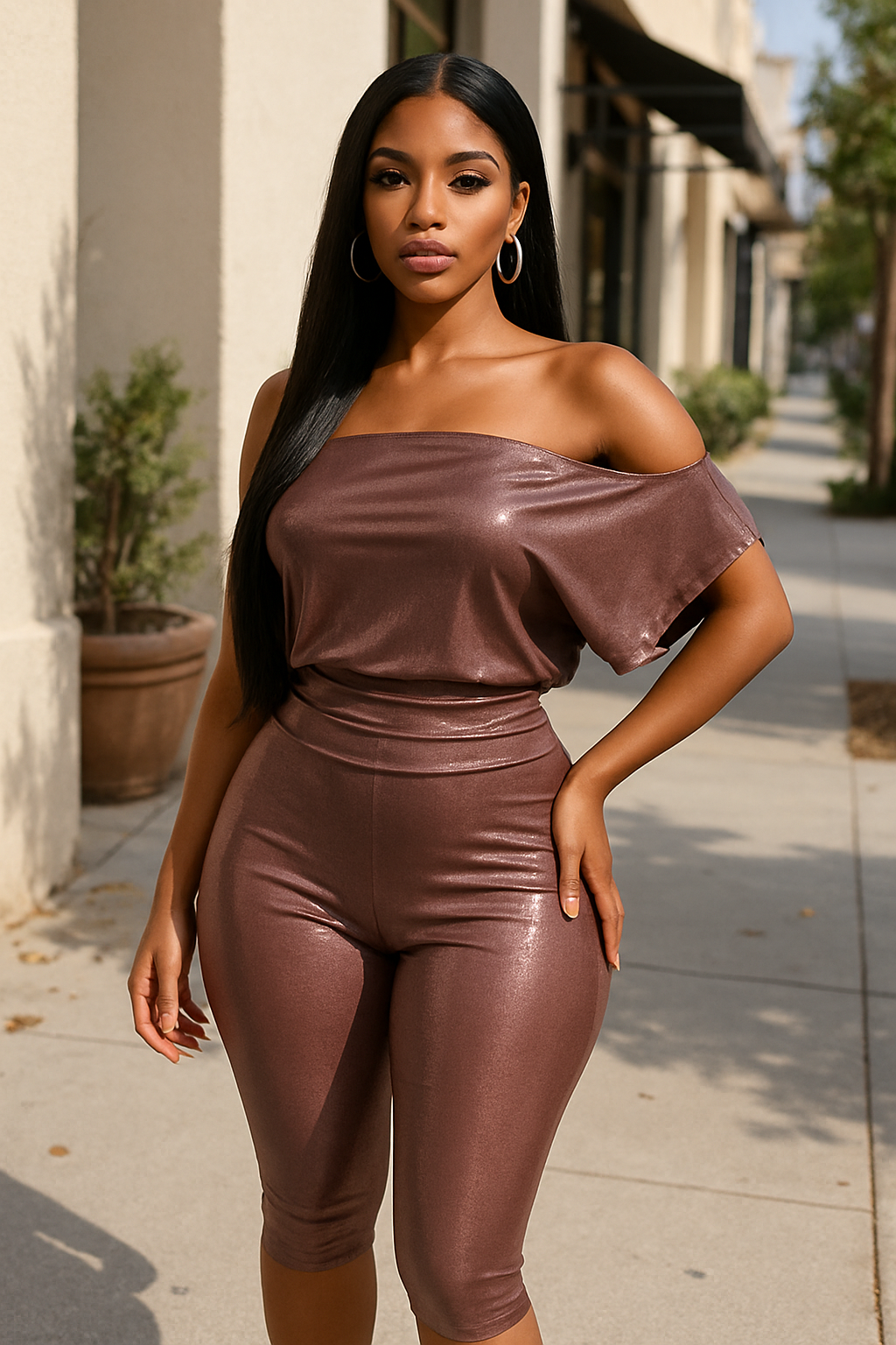 Make a statement in this loose fit shimmer top and capri set, designed for a comfortable yet stylish look. The sleeveless top features an asymmetrical cut and a sleek, pull-on style, creating an effortless silhouette that drapes beautifully. The capri bottoms are equally chic, designed with an elastic waistband for an easy, flexible fit and a straight hem for a polished finish. Made from a soft, stretchy blend of 95% polyester and 5% spandex, this set ensures comfort and a flattering fit without compromising on style. Perfect for casual days or adding a touch of shimmer to your everyday wear.