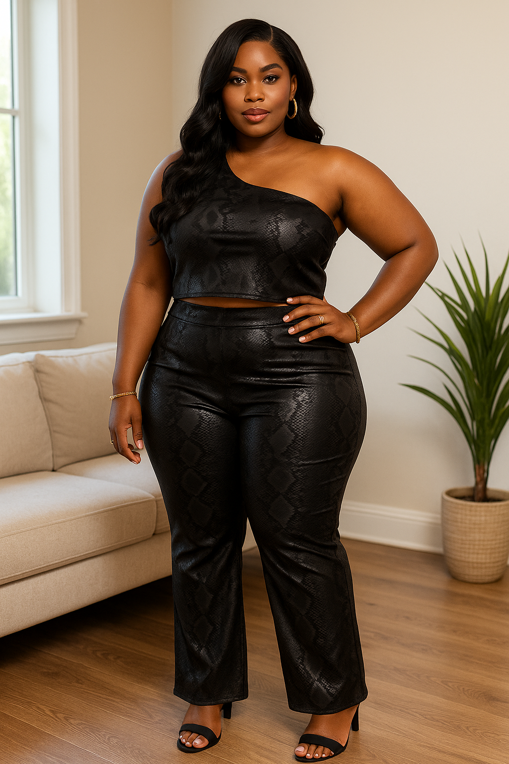 Unleash your bold, adventurous side with The Night is Calling Set. This fierce faux leather snake print pant set features a crop top and wide legs for a daring look. The elastic waist and stretchy materials ensure a comfortable fit, perfect for taking on any challenge. Answer the call and make a statement!